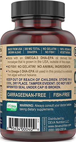 NON-FISH SOFTGEL: This algae omega nutritional supplement does not have a fishy taste. DEVA Vegan DHA & EPA oil is encapsulated in non-animal vegan softgels, and it is CARRAGEENAN-FREE. There is no gelatin, no fish or other animal-derived ingredients.