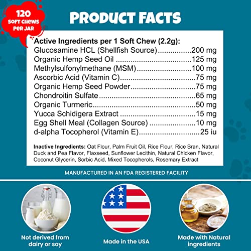 Made in the USA: We’re proudly partnered with the NASC (National Animal Supplement Council). If your dog supplement brand isn’t a member, you have to ask yourself why. This hemp mobility chew for dogs is made in a USA with locally sourced ingredients, in an FDA registered facility that meets GMP approved manufacturing standards. Each soft chew comes packed with the nutrients needed to help support your dog’s mobility. Order our Glucosamine Chondroitin for dogs with confidence.